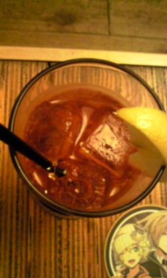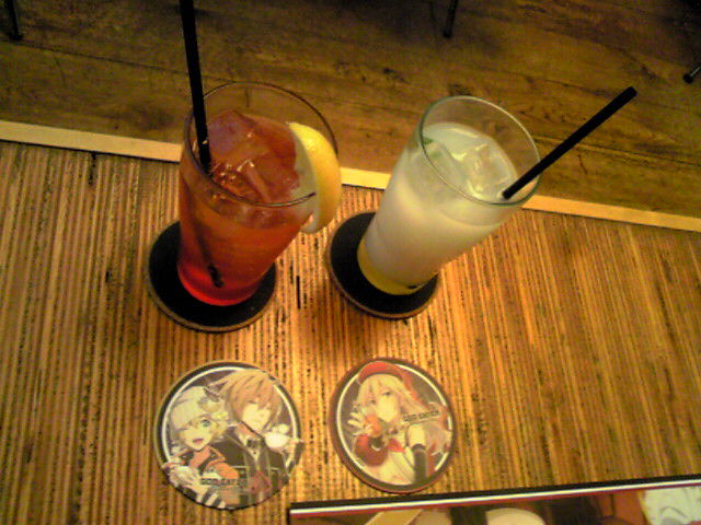 原画に見入っている間に飲み物がテーブルに届いてました。ランダムでもらえるイラスト入りコースターは何かとドキドキしていたら友人に表を隠されて