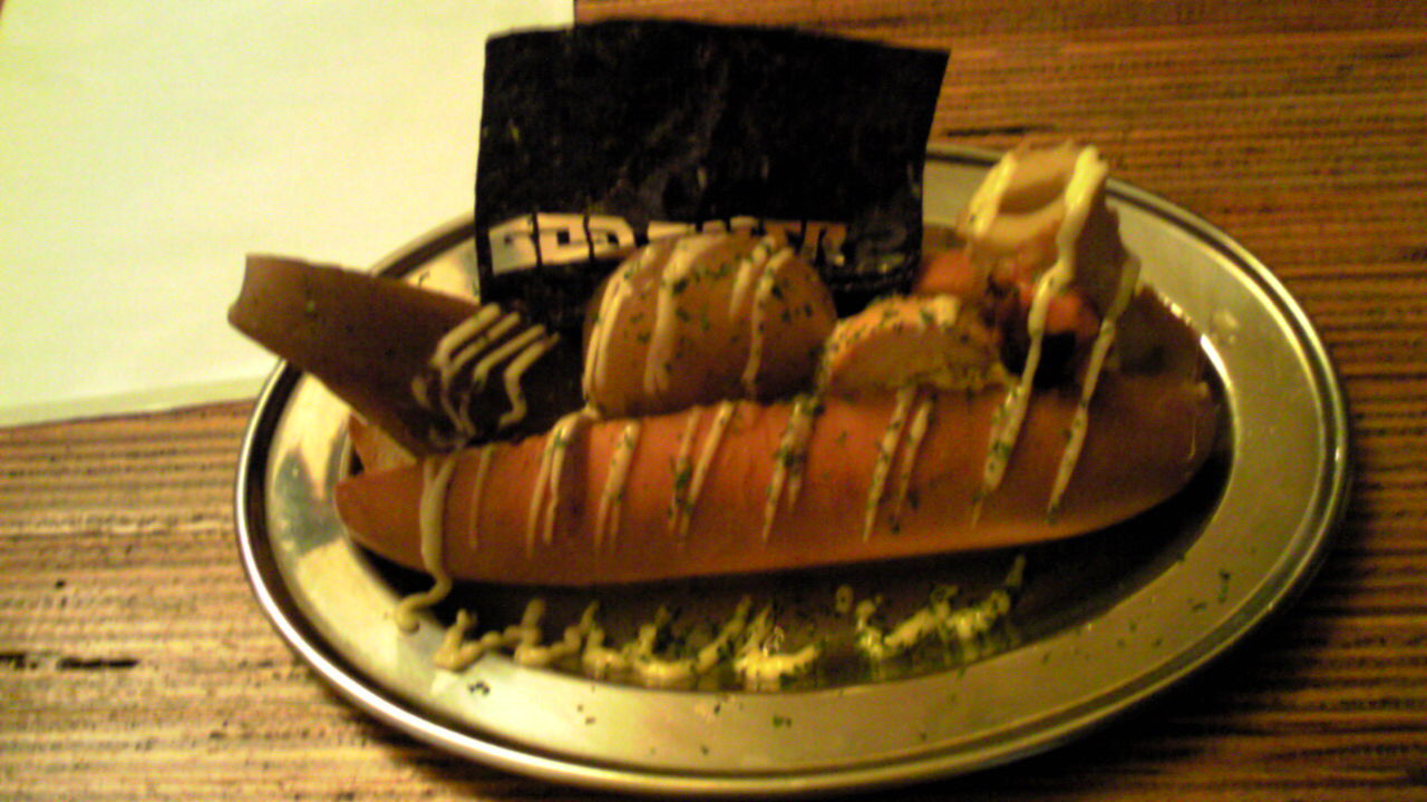 白いのはマヨネーズかな、しょっぱかったです。からしが効いていてパンとおでんを繋いでいました。挟まってる具はちくわ・タコ・卵・大根・こんにゃくです。煮物を挟んだ和風ホットドックという感じかもしれません。いけます。