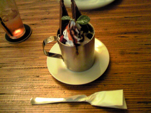 チョコレートケーキが刺さってますw中にもチョコレートアイスが入ってます。ベリーが飾られていて甘いチョコとベリー系のすっぱいのが丁度良い感じで美味しかったです。