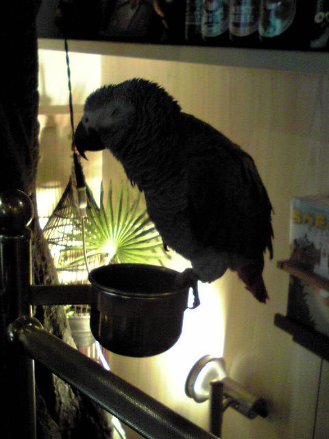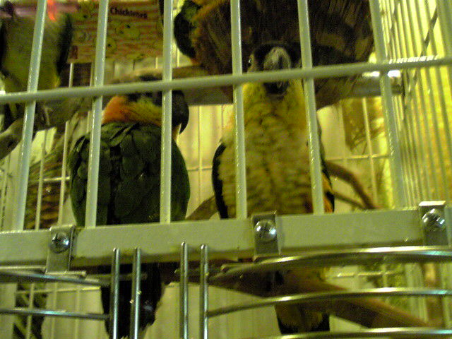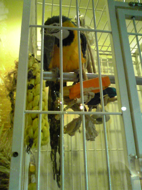 中には別のガラス扉の向こうに大きなケージがいくつかあり、シロハラインコ・ルリコンゴウインコ・ショウジョウインコなどがいました。ケージに入っていないヨウムがカウンター前にいました。ルリコンゴウさんはさすが鳴き声が大きかったですがw