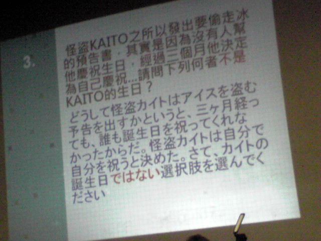 その中の一つ「怪盗KAITO vs 東京電腦探偵團」という企画、東京電脳探偵団の団員になってミクから出題される問題に答えて怪盗KAITOを捕まえるという趣旨。13時から30分ごとにステージ上に問題が出されてチケットの裏に答えを書いていきます。
