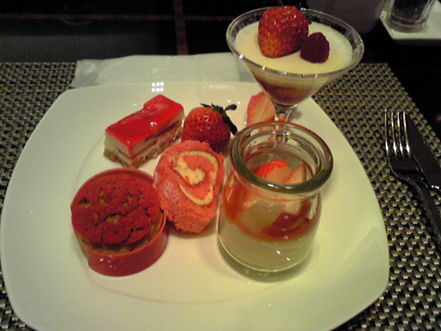 一皿目の左下に移っているいちごのシュークリームが美味しかった!シュー部分がいちごのチョコでぐるっと巻かれてます。